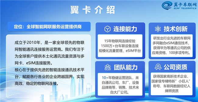 作为国家级专精特新“小巨人”企业,翼卡深耕物联网连接领域15年,积累了千万级设备连接经验,在俄罗斯市场已构建起“技术+资源+服务”三位一体的核心能力 。未来,翼卡将持续聚焦IPC领域的场景化需求,优化本地流量方案、跨境连接、合规管理等服务,助力更多IPC企业跨越俄罗斯市场壁垒,实现业务深耕与长效增长,共筑中俄跨境物联新生态 。